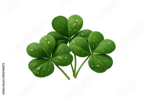 © PNG Kingdom , Obraz premium Three leaf clover leaves with dew drops representing luck, st patrick's day, and nature, isolated on transparent background