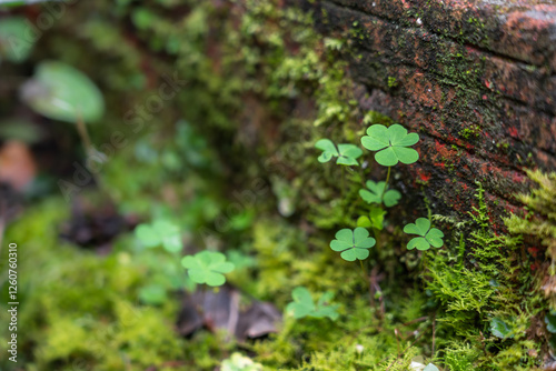 © juanjos, Fototapeta premium Three leaf Shamrock leaves close up. Close up of a bunch of green clover. Green clover background