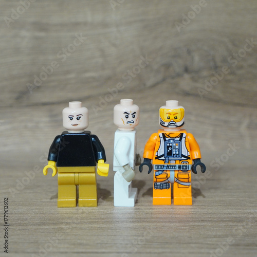 © Everyday Frame, Naklejka premium Three Lego Minifigures Standing Together on a Wooden Surface