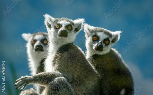 Obraz premium Three lemurs.,looking at camera. Yellow eyes.Contact eye. Green Blurry background. Wet nosed animals. Lemuriformes.