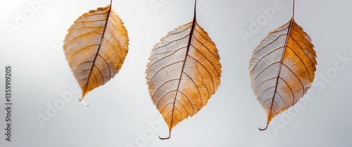 © AkuAku, Fototapeta premium three light tree leaf skeletons on a white background, isolated