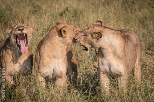 © simoneemanphoto, Fototapeta premium Three Lions playing in the grass.