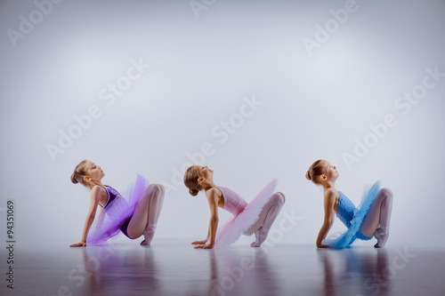 Naklejka premium Three little ballet girls sitting in tutus and posing together