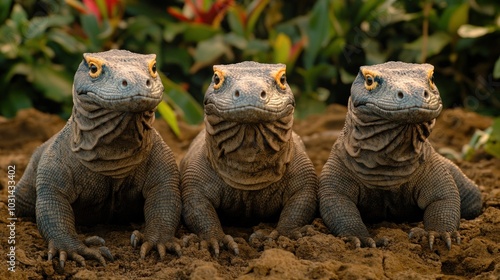 © julio, Obraz premium Three lizards sitting on the ground amidst lush greenery.