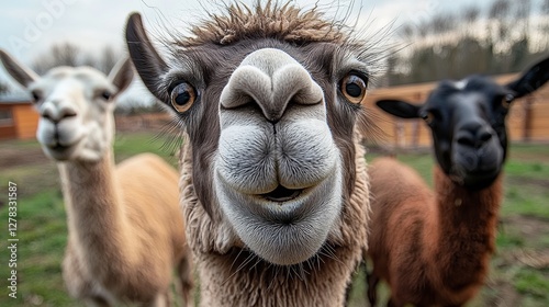 © Nataliia_Trushchenko, Obraz premium Three llamas are standing in a field, one of which is smiling. The other two are looking at the camera