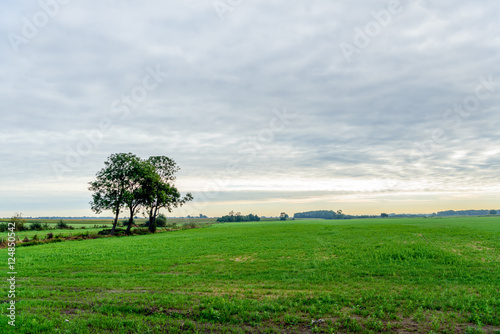 © Ruud Morijn, Obraz premium Three lone trees in a flat rural landscape