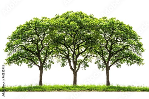 © sengah, Obraz premium Three lush green trees isolated on white background, symbolizing nature and environmental beauty