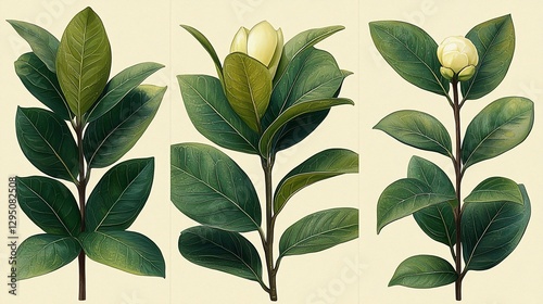 Fototapeta premium Three magnolia branches with leaves and blossoms, detailed botanical illustration.