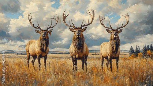 © YudhoStd, Obraz premium Three majestic deer stand in a golden field under a dramatic sky.