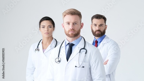 Fototapeta premium Three medical professionals in white coats with stethoscopes.