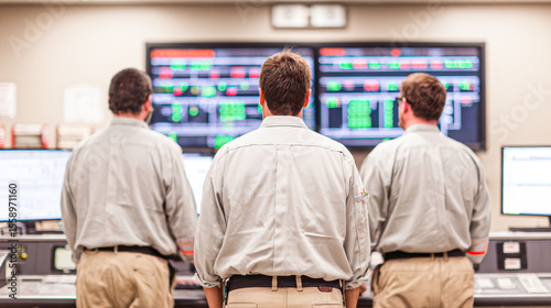 © Kowit, Fototapeta premium Three men in uniform monitor multiple large digital screens displaying data and charts in a control room environment.