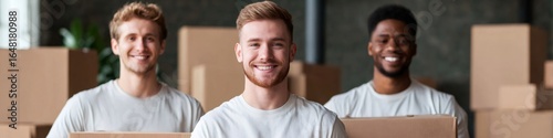 © Margarita Ratatosk, Obraz premium Three men smiling and carrying boxes for moving, showing professional moving and delivery service.