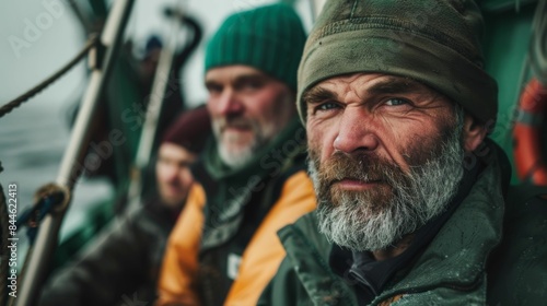 © iuricazac, Fototapeta premium Three men with beards wearing life jackets and hoods on a boat in the rain.
