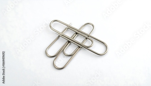© Tiramisu, Fototapeta premium Three metal paperclips arranged on a white surface.