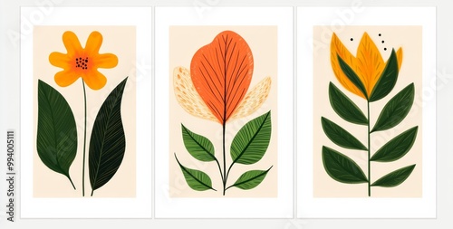 Fototapeta premium Three minimalistic botanical illustrations featuring simple shapes and lines...