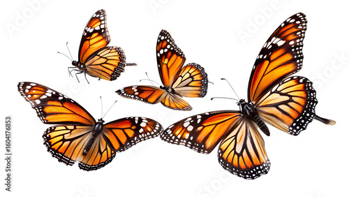 Fototapeta premium Three Monarch Butterflies in Flight: Vibrant, Detailed, Black Background