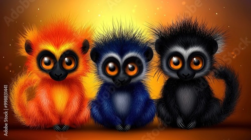 © Sonya, Fototapeta premium Three monkeys on top of yellow and orange backgrounds, facing red and orange backdrops