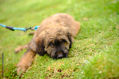 © Victor Santacruz, Fototapeta premium Three-month-old Catalan working dog happy in a grassy park, with an intense and beautiful look
