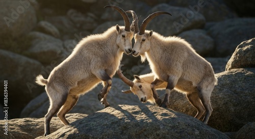 Fototapeta premium Three mountain ungulates engaged in a display of dominance on rocky terrain