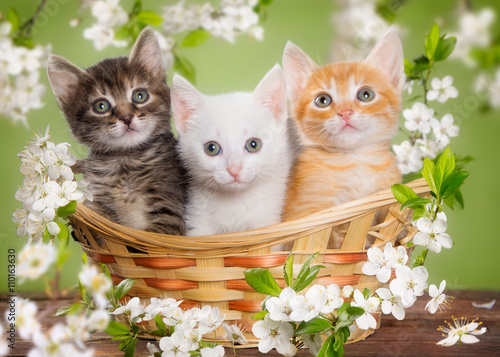 © mak80, Obraz premium Three multi-colored kitten sitting in a basket surrounded by flowers