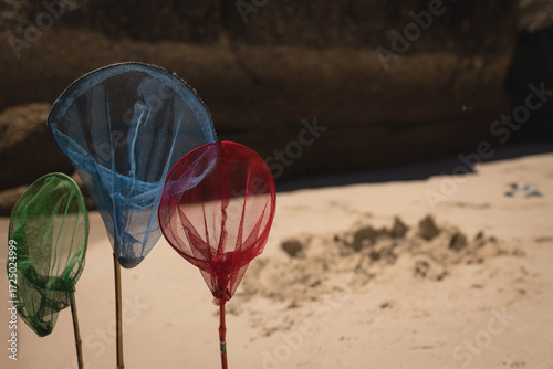 Naklejka premium Three multicolored mesh nets are standing in sand on beach near dark rock and...