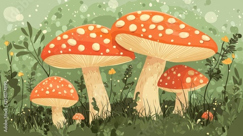 © Dara, Obraz premium Three mushrooms with white spots on a green background