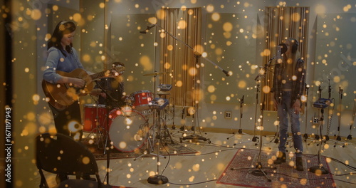 Fototapeta premium Three musicians jamming together in recording studio, with acoustic guitar...