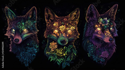 © Nika Lovecraft, Naklejka premium Three mystical foxes adorned with glowing floral tattoos and luminous patterns gaze intensely against a black backdrop The sticker-style artwork features vivid colors, high-contrast shading, and hyper