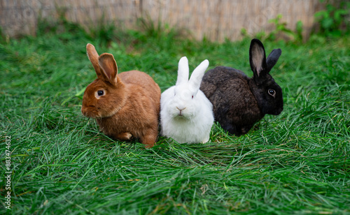 Obraz premium Three new zealand red white black rabbits sit on green grass on a sunny day before Easter