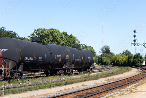 © The Bold Bureau, Naklejka premium Three oil tanker freight train cars are seen together, stationary in a rail yard during the day.