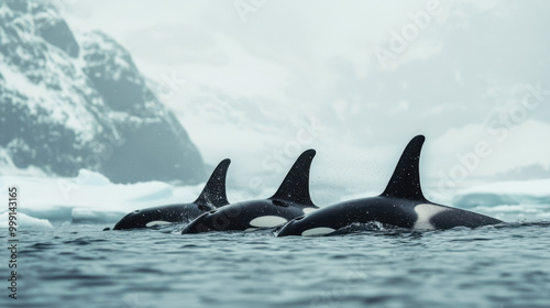 Fototapeta premium Three orcas swimming in icy waters with snow-covered mountains in the...