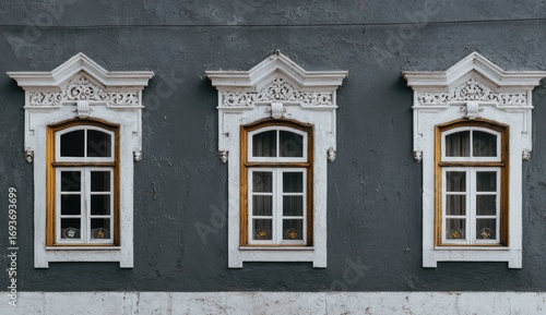 © Stussy, Obraz premium Three ornate windows on a textured gray wall