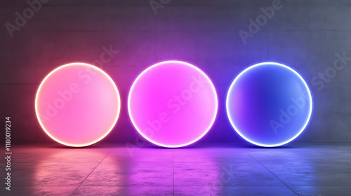 © lisa, Obraz premium Three Oval Neon Lights Illuminate A Dark Room