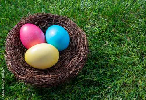 Fototapeta premium Three painted easter eggs in a nest on green grass