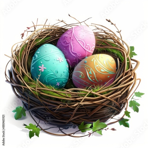 © zz, Fototapeta premium Three Painted Eggs in a Birds Nest