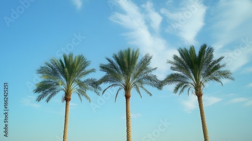 © Saimon, Fototapeta premium Three Palm Trees Against Blue Sky Summer Vacation Tropical Landscape