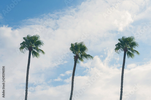 Obraz premium Three palm trees on a cloudy blue sky background. Summer vacation and travel...
