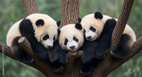 © karepmu, Obraz premium Three Pandas Relaxing in a Tree.