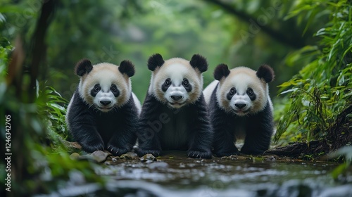 © Almahyra, Fototapeta premium Three pandas sitting by a stream in a lush forest.