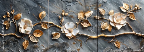 © Sara_P, Obraz premium Three panel marble art with abstract floral elegance for contemporary wall decor
