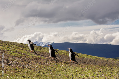 © Angelo D'Amico, Obraz premium Three Papua penguin walking on hill