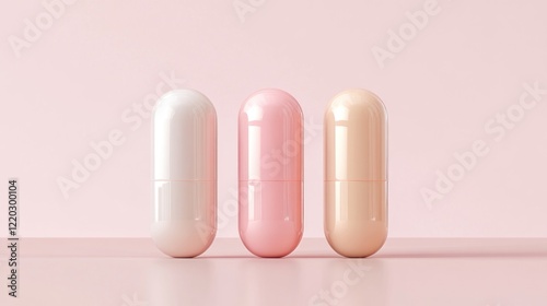 © Fenny, Obraz premium Three pastel capsules on pink background. Health supplement mockup