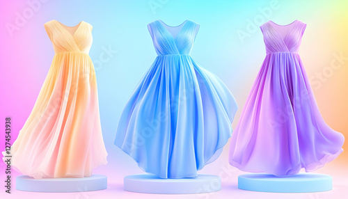 Obraz premium Three pastel colored flowing dresses on podiums. Fashionable display