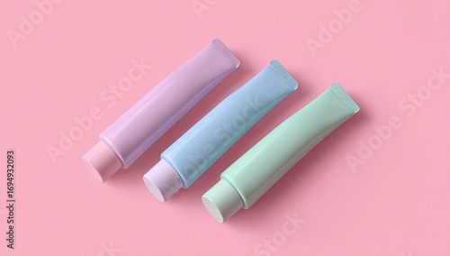 © Ehsan, Fototapeta premium Three pastel-colored tubes of cosmetic product on a pink background