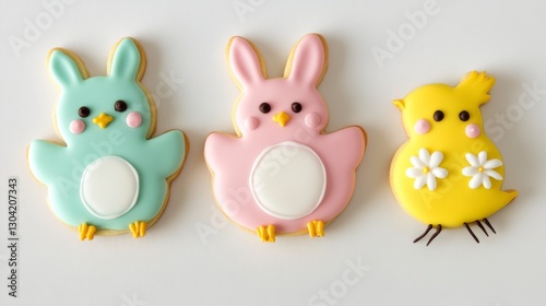 Naklejka premium Three Pastel Easter Cookies Shaped as Bunnies and a Chick on White Background