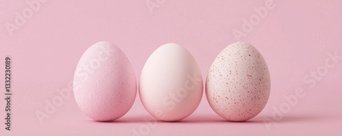 Fototapeta premium Three pastel eggs in varying shades of pink set against a soft pink...