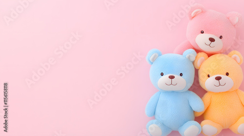 © Halfjoy, Obraz premium Three Pastel Teddy Bears On Pink Background
