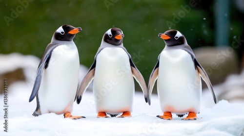 © Kaminashi Nozomi, Fototapeta premium Three penguins in snowy habitat