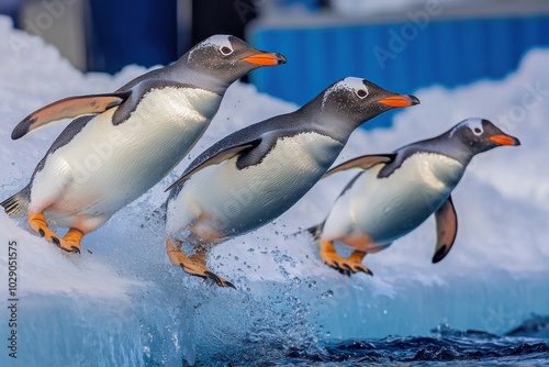 Fototapeta premium Three penguins leap from an icy ledge into the water, showcasing their...