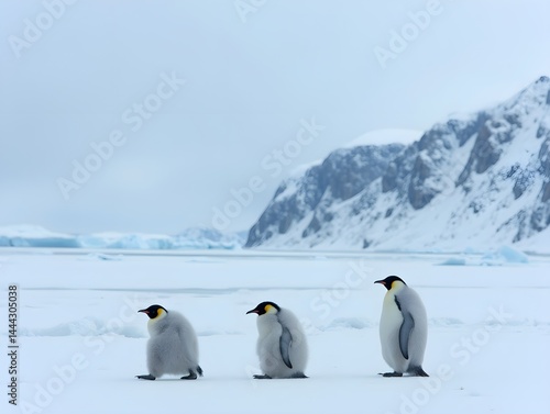 © Moopingthelittlecat, Naklejka premium Three penguins walking on the ice in front of a snow covered mountain